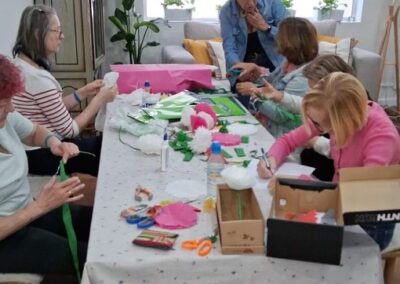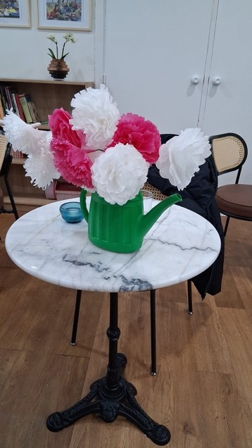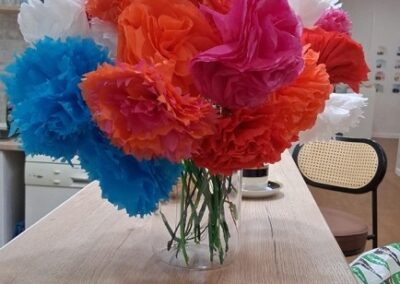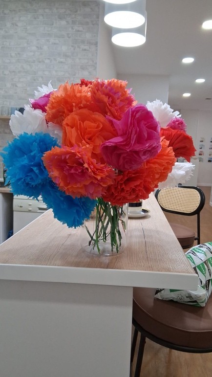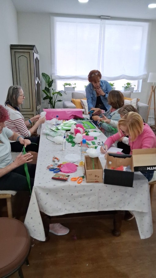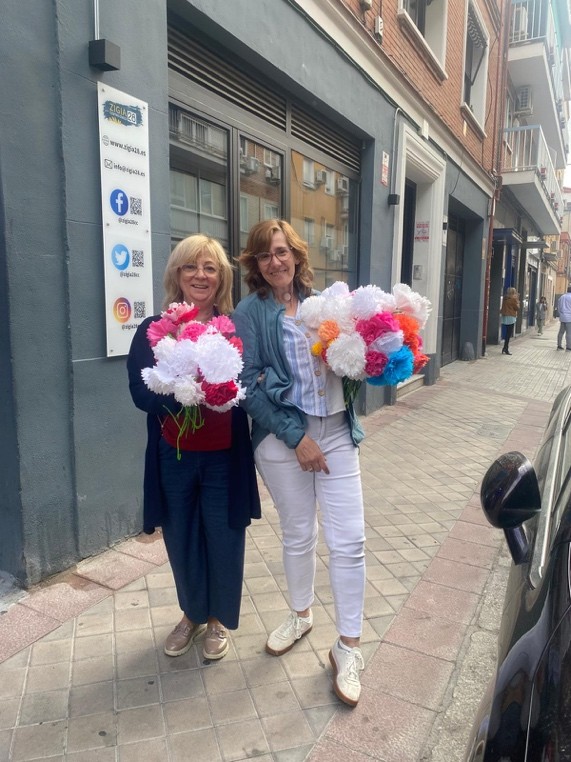 El objetivo del taller fue elaborar estas flores para un evento de otra asociación, reforzando así nuestro compromiso con el apoyo mutuo y el trabajo en red. Cada clavel, hecho a mano, simbolizaba no solo color y belleza, sino también el valor de la colaboración entre entidades que comparten una misma mirada social.